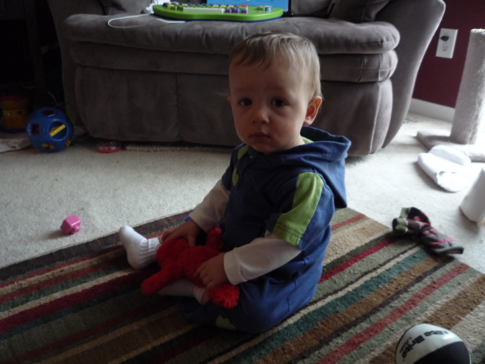 Words: Ant's first real word was dog. He has actually been saying mama and dada for awhile but dog is his first word other then those. We noticed he was saying it a few days before his birthday at our friends house. We don't have a dog, so it is surprising that it is his first word. He is also saying kitty, milk, and duck. Most of his words are missing the last consonant. When he says dog it sounds like "daw."